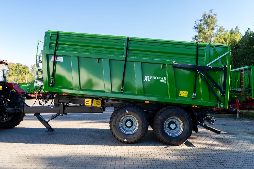 The monocoque PRONAR trailer T669 is intended to work under hard conditions. Tight, solid construction of the loading case enables to transport even tiny grains without any additional sealing. The grain hatch placed in the rear wall facilitates unloading and connection to the other more precise and efficient unloading equipment which is very important while transporting low density materials. Tandem suspension ensures increase pulling force thanks to additional weight placed on the rear axle. High tonnage load capacity will be well appreciated by all users.