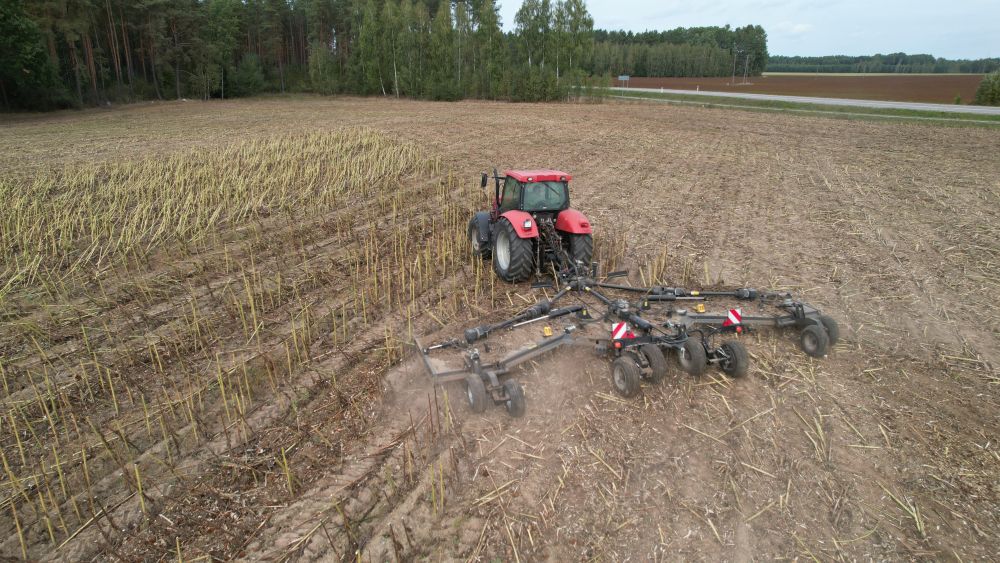 Ses cinq têtes de coupe rotatives horizontales, équipées chacune de trois (ou six en option) lames, offrent une largeur de travail impressionnante de 9 mètres, garantissant un broyage rapide et efficace des chaumes, résidus de culture, herbes et broussailles.